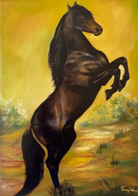 Diz a crítica de arte Vera Atagiba ao comentar a tela em que a artista retrata o cavalo: “Perfeccionista em detalhes… Vejam a imponência desta tela premiada de Theozilda Machado.”
