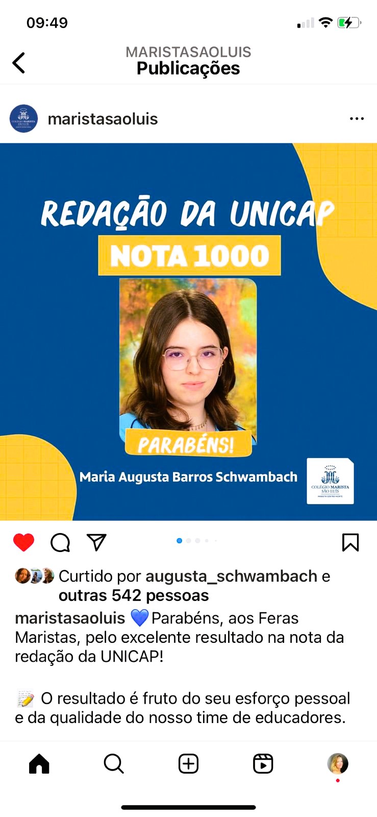 11- MARIA AUGUSTA BARROS SCHWAMBACH – Em outubro de 2023, concorrendo ao Curso de Direito da UNICAP (Universidade Católica de Pernambuco), obteve nota máxima na redação e o segundo lugar na classificação geral.