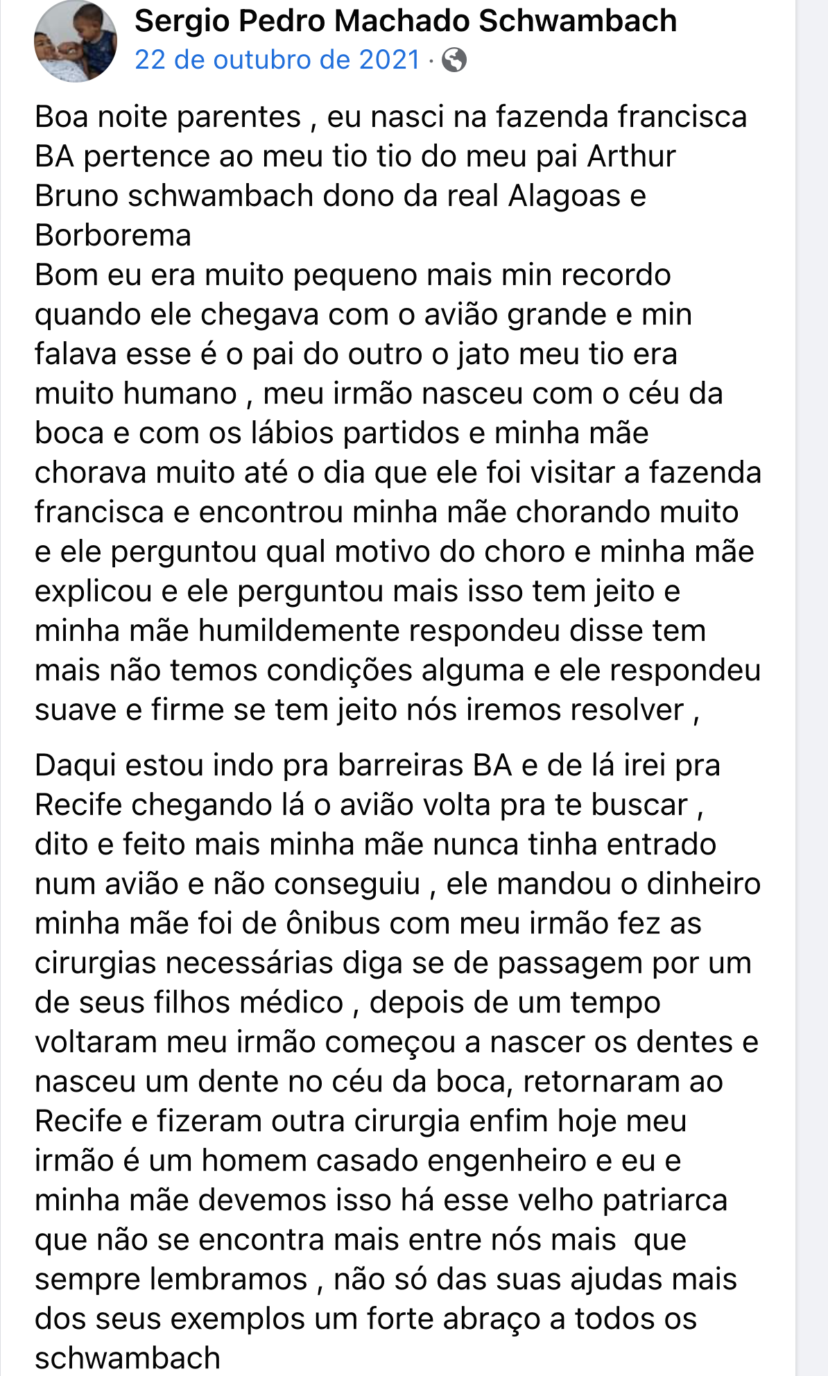 Sérgio assim escreveu: “Descobri que o primo, ARTHUR BRUNO SCHWAMBACH tem uma biografia incrível . Ele é bisneto de JEAN JOSEPH VERVLOET. ARTHUR BRUNO SCHWAMBACH foi o empresário fundador do grupo Borborema. É mais um descendente da nossa Família que fez história no Brasil. Um grande orgulho para todos da nossa Família VERVLOET e SCHWAMBACH.“