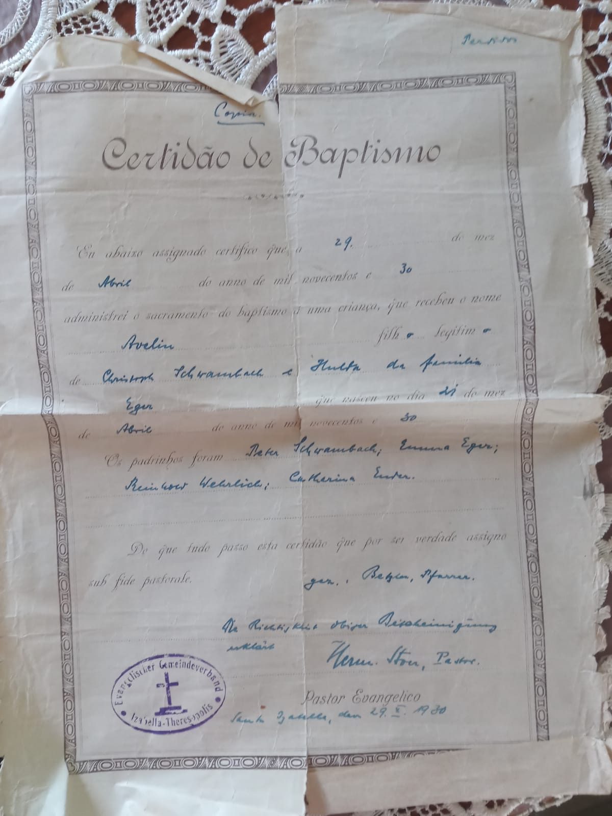 Nesta semana de junho de 2022, fui tentar descobrir mais histórias da minha família, não sei ao certo. Mas descobri que o nome do meu tataravô é Peter Schwambach, nascido em 1856 e falecido em 1938, com 82 anos. Ele que batizou o meu avô em 29 de abril de 1930. Teve de dez a onze filhos: Felippe Pedro Schwambach, Catarina Schwambach, Pedro Schwambach, Carlos Schwambach, Philipp Junior Schwambach, Pedro Junior Schwambach, Karl Peter Schwambach…