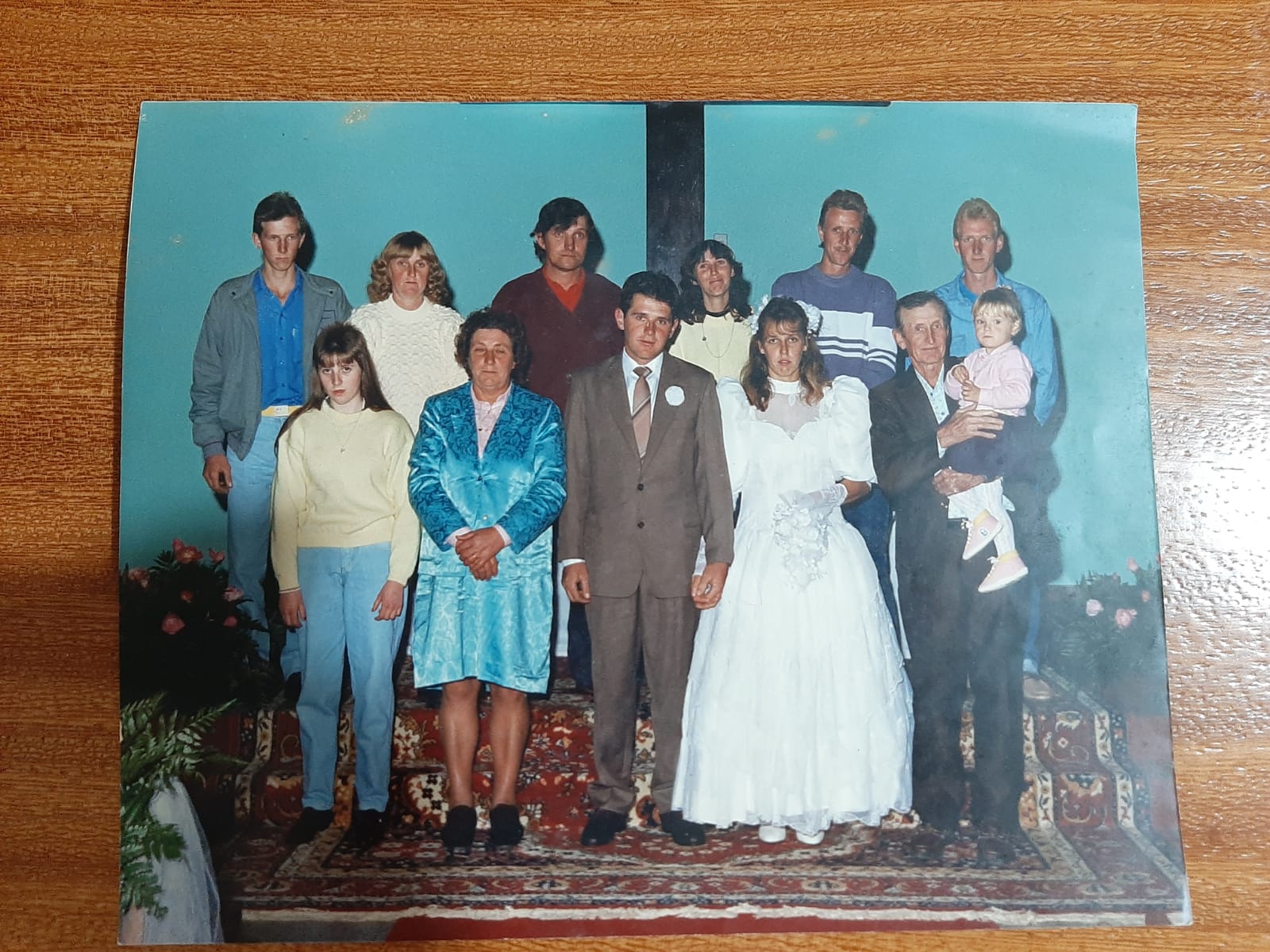 Foto do casamento de Janete Schvambach e Alceu Heinz, Em cima: Lauro José Schvambach, Marlene Schvambach, Lauro, Louredete Izabel Schmitz Schvambach, Nilvo Schvambach e Silvio Schvambach. Em baixo: Janete Ender Schvambach, Gerta Werlinch Schvambach, Alceu Heinz, Janete Schvambach, Avelino Schvambach e Maiara Aline Schvambach (colo).