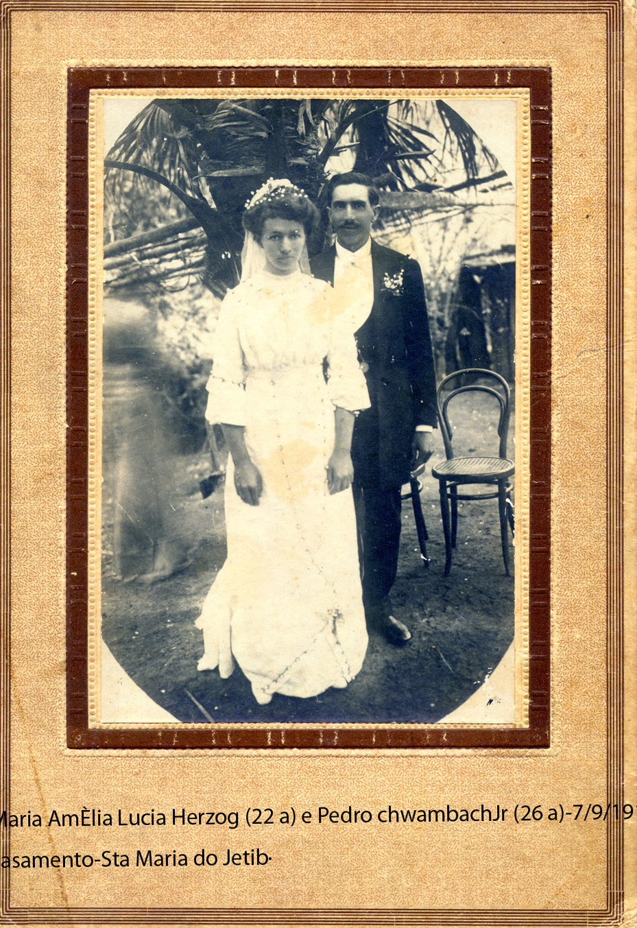 Casamento de PEDRO SCHWAMBACH JÚNIOR e MARIA AMÉLIA LÚCIA HERZOG, em 7 de setembro de 1913, Ele com 26 anos, ela com 22 anos de idade.