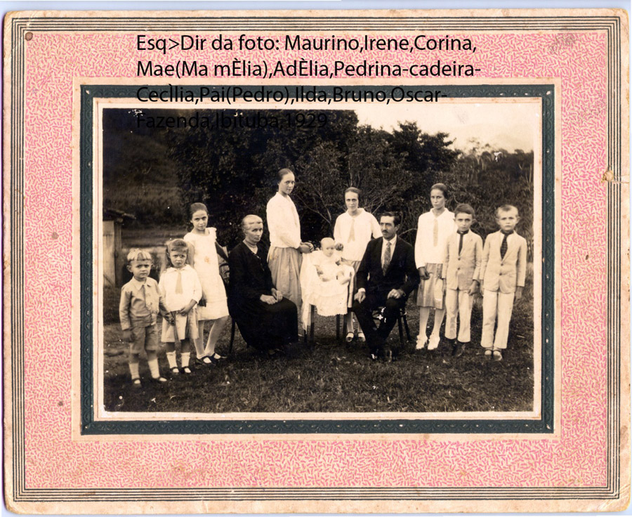 Casal PEDRO e MARIA AMÉLIA com os filhos Maurino, Irene, Corina, Adélia, Pedrina (na cadeira), Cecília, Ilda, Bruno e Oscar (listados da esquerda para a direita). Neste registro não estão os filhos Nely e Mário que não haviam nascido. O mais jovem é Pedrina, nascida em julho de 1928. Portanto a foto é dos últimos meses de 1928 ou dos primeiros meses de 1929.