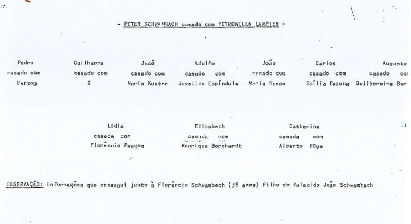 Heredograma construído por Roberto Anselmo Kautsky da primeira geração de descendentes do casal Pedro Schwambach / Petronilsa (ou Petronella) Lampier. O primeiro filho denominado Pedro é PEDRO SCHWAMBACH JÚNIOR, casado com Herzog que é MARIA AMÉLIA LÚCIA HERZOG, como era chamada antes do casamento.