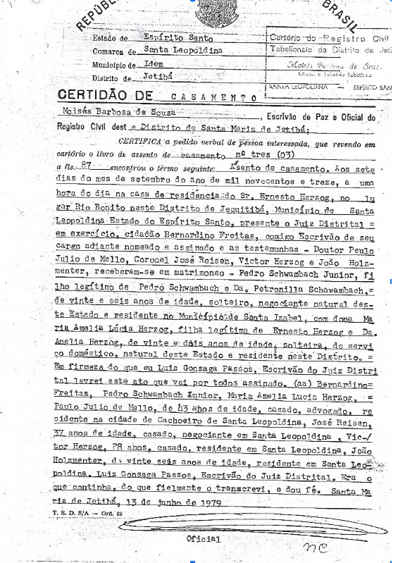 Serão reproduzidos, a seguir, documentos importantes na vida do casal PEDRO SCHWABACH JÚNIOR E MARIA AMÉLIA LÚCIA HERZOG SCHWAMBACH.