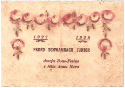 PEDRO SCHWAMBACH JÚNIOR Júnior alcançou certo destaque na comunidade de Afonso Pena, mais tarde Ibituba, sendo inclusive nomeado Juiz de Paz . O cartão de Boas Festas, 1927-1928, aqui mostrado, é evidência de que o casal e seus filhos tinham nível cultural diferenciado.