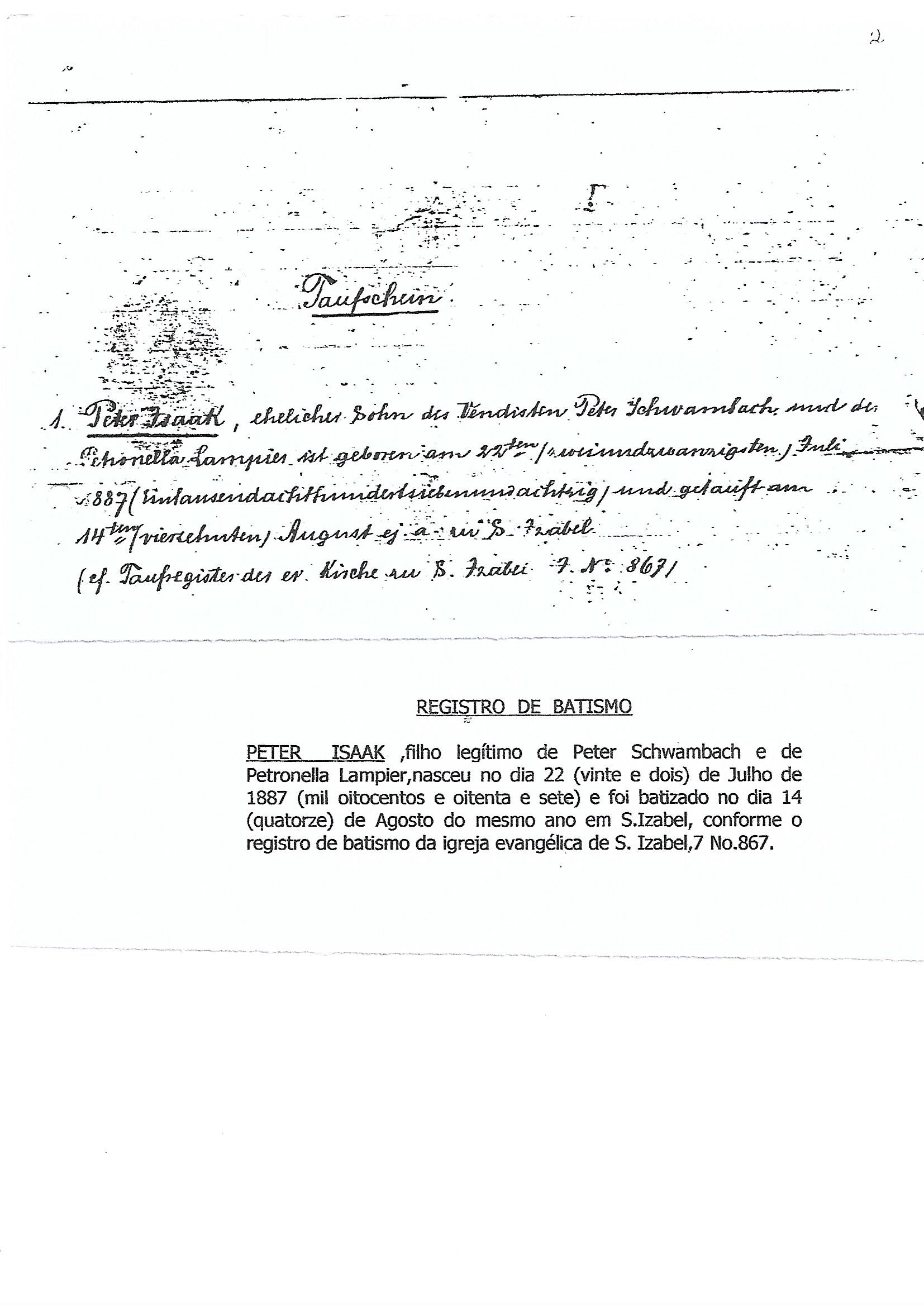 BATISMO DE PEDRO SCHWAMBACH JUNIOR, EM ALEMÃO COMO EXISTE NOS ARQUIVOS DA IGREJA EVANGÉLICA DE SANTA ISABEL, E EM PORTUGUÊS. OS NOMES DO PAI E DA MÃE E A DATA DE NASCIMENTO NÃO DEIXAM DÚVIDA DE QUE PEDRO SCHWAMBACH JUNIOR E PETER ISAAC SÃO A MESMA PESSOA.