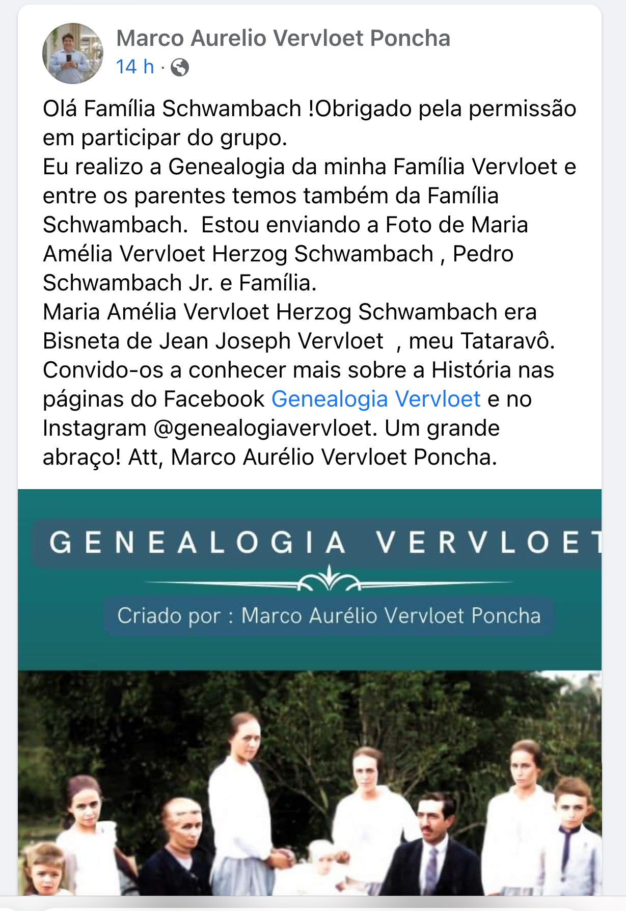 Em junho de 2022, os organizadores do SITE conheceram o texto, a seguir mostrado, postado no FACEBOOK, por MARCO AURELIO VERVLOET PONCHA, que cita a participação dos VERVLOET na genealogia dos SCHWAMBACH.